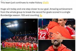 他也在赛后通过社媒晒出比赛照,并庆祝胜利:“这支球队仍在创造历史🙌🙌今天取得重大胜利,离我们的目标又近了一步。全队共同努力取得非凡成就,打破了德甲单赛季进球纪录。目前已经105球了,而且还在继续增加!”