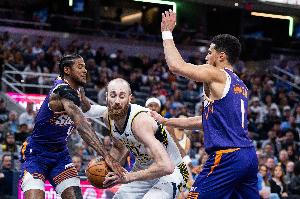 上半场比赛,太阳进攻端主要靠布克和杰伦·格林撑起,二人里突外投都效率在线。布克12中10,三分3中3砍下23分2篮板4助攻;格林12中8,三分5中3砍下19分4篮板1助攻1抢断。